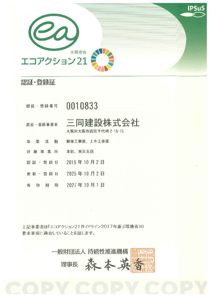 この度、弊社が取り組んでいる「エコアクション21」の認証更新手続きが完了いたしました。エコアクション21は中小企業のための環境マネジメントシステムとして脱炭素社会の実現、さらにはSDGsの実現につながるものです。弊社は引続き、環境マネジメントに取り組み、環境に配慮した事業活動および持続可能な社会の実現に尽力いたします。
